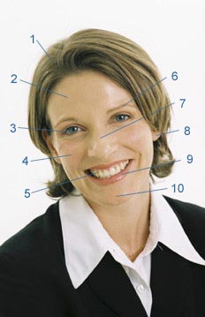 oko, policzek, włosy, usta, podbródek, brwi, zęby, nos, czoło, ucho.